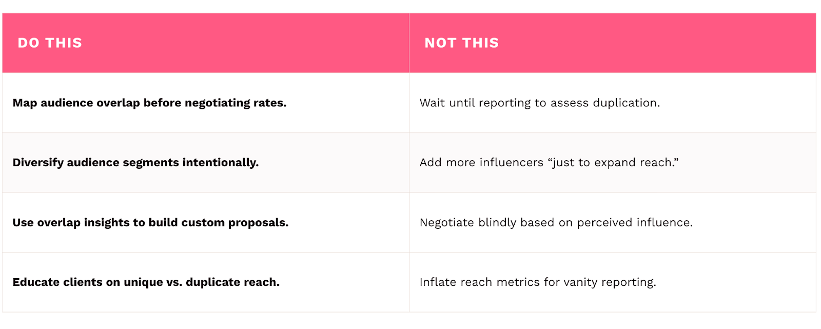 Having insights into influencer audience overlap data can give you plenty of leverage to inform and strengthen your campaigns. Here are some tips to make the most of it.