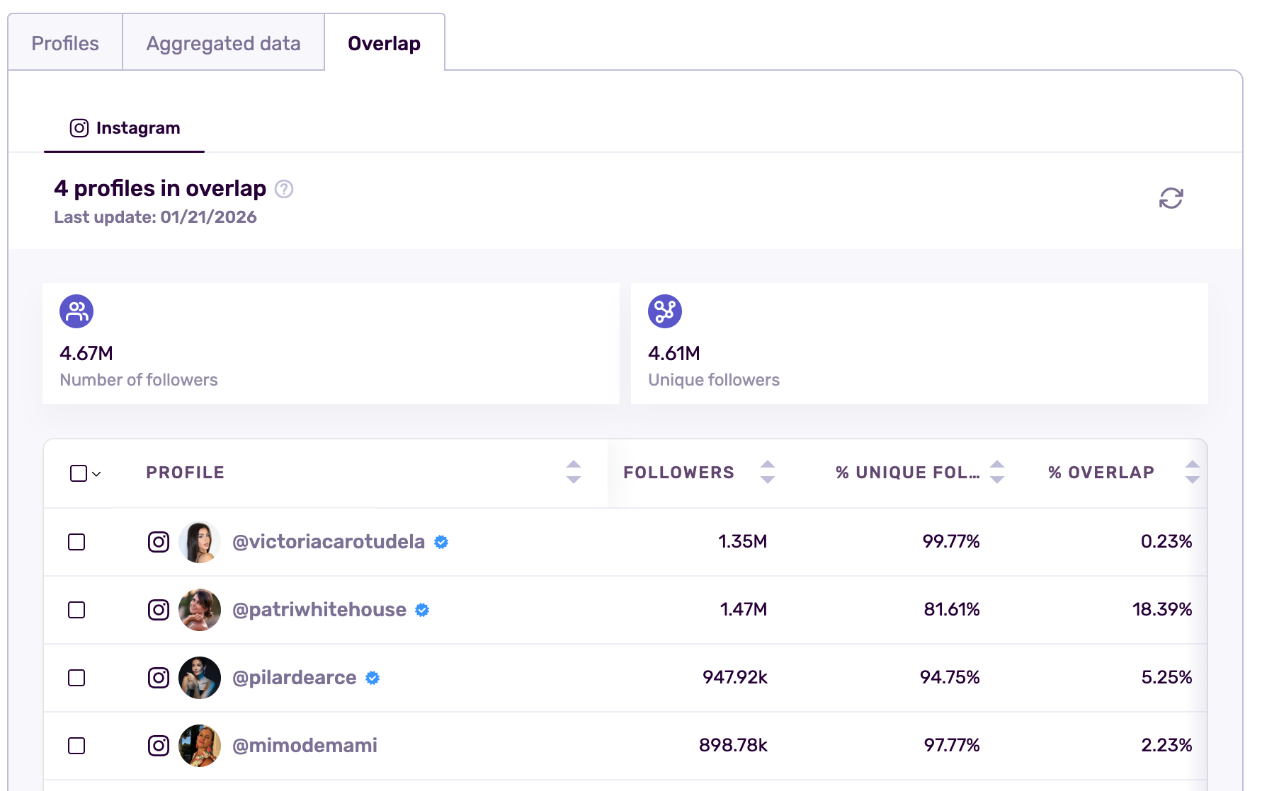 Know exactly what each creator adds to your total audience pool. This lets you build data-backed arguments for fee adjustments, where you could negotiate lower fees with influencers having a high audience overlap.