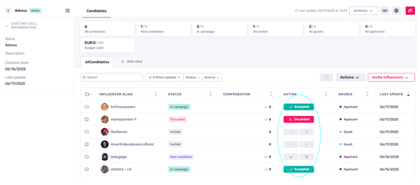As applications come in, they appear in your Casting Call dashboard. You can accept or reject candidates with a single click. Accepted creators move into your campaign workflow and IRM, where you can continue managing deliverables, payments, and relationships.