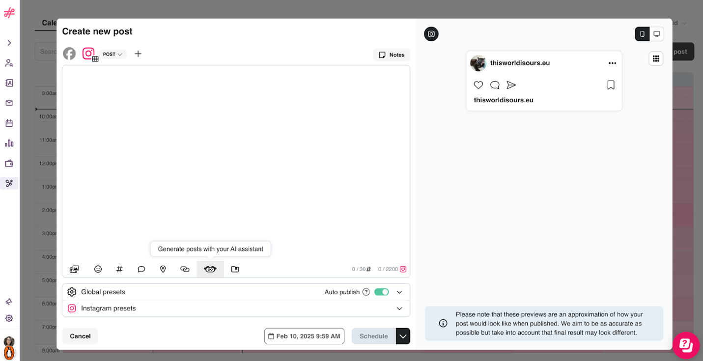 Additionally, you can use AI to generate ideas for your captions or enhance existing ones – whether you want to make them longer, shorter, friendlier, or more professional. Influencity’s social media planner lets you generate copy ideas in an instant with the help of an AI assistant.