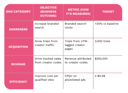 Pair awareness movement with hard outcomes like trials, demo requests, code usage, and assisted conversions.
