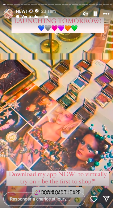 Stories are also one of the few places on Instagram where you can share product images and directly link to an associated landing page. So they’re great for sharing CTAs and driving instant purchases. Notice how Charlotte Tilbury adds a custom CTA to the following Story, encouraging customers to try the virtual try-on tool and see which Unreal shade matches them.