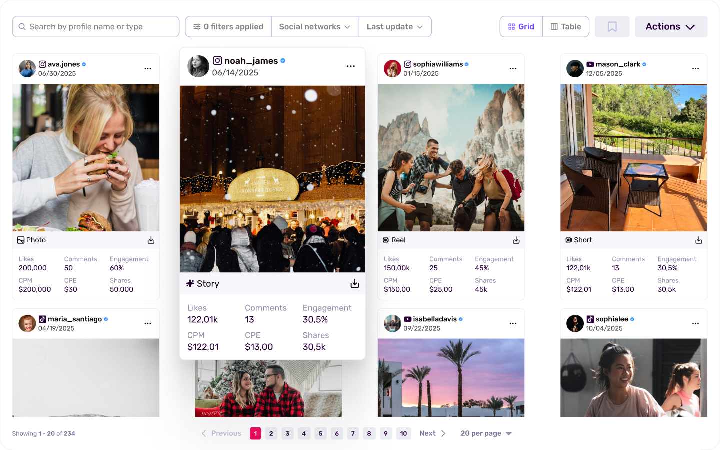 Influencity streamlines influencer content tracking with automatic retrieval. The platform automatically collects every post and Story from influencers, so you can track them all in one place. You don’t need to put together links in messy spreadsheets and manually check content performance multiple times.