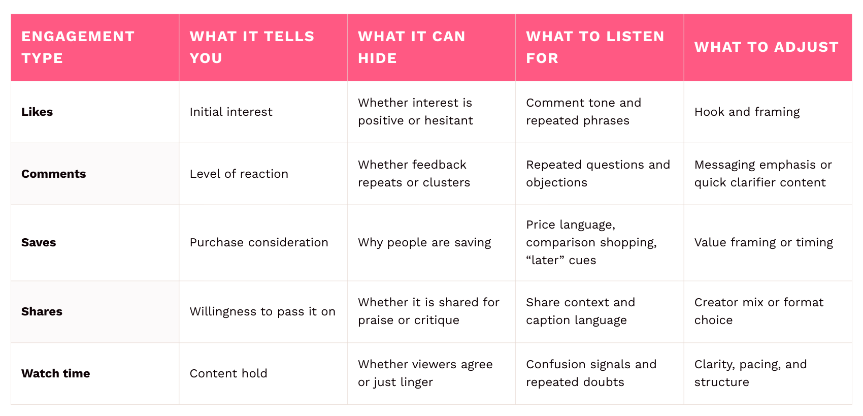 That combo usually means the content grabbed attention, but people still do not understand value, fit, or why it matters.
