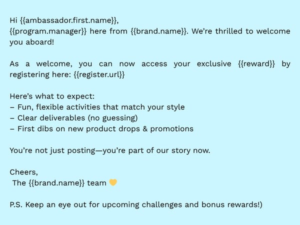 The moment a creator officially joins your campaign or ambassador program, your welcome experience becomes your handshake, your contract, and your tone-setter all at once.This is your chance to say: