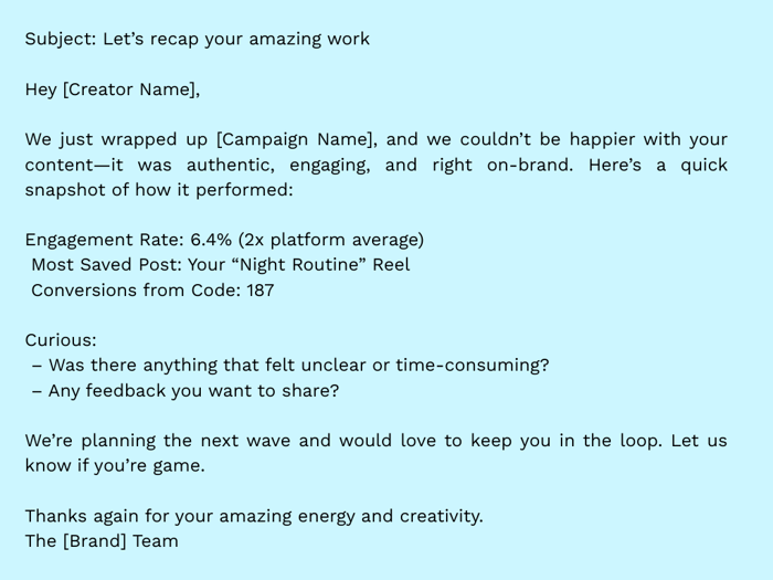 Here is a sample creator recap email you can use to check on your creators’ experiences: