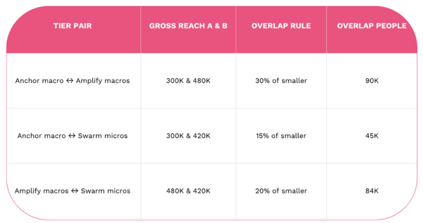 Rule tip: Apply the overlap percentage to the smaller of the two reach numbers in each pair everywhere. This prevents over-deduping.
