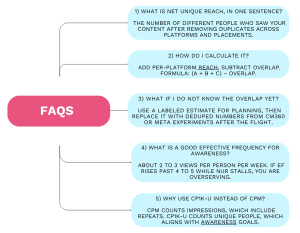 Lead with Net Unique Reach. Show Effective Frequency and CP1K-U alongside it so reach becomes actionable. Post-level reporting helps you pick creative winners; creator-level reporting guides which partners to invest in; and the campaign one-pager proves impact without double-counting. Over time, replace overlap estimates with measured, deduplicated numbers, so forecasts become sharper with each flight. The outcome is simple: more new people reached the right number of times, with less waste and clearer decisions.