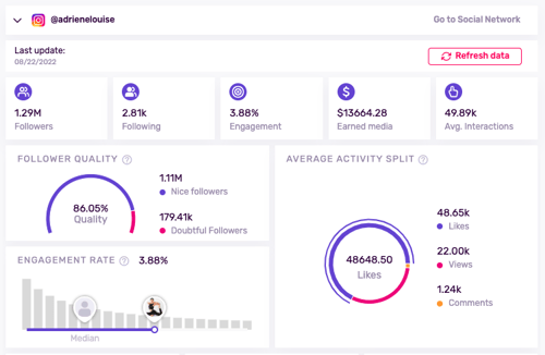You can further strengthen the data with an audience quality score. This analyzes the influencer’s followers for quality, helping you distinguish between followers that seem authentic vs. followers that seem fake. It factors in engagement rates, profile information, and follower activities to figure out what percentage of an influencer’s followers are real people.