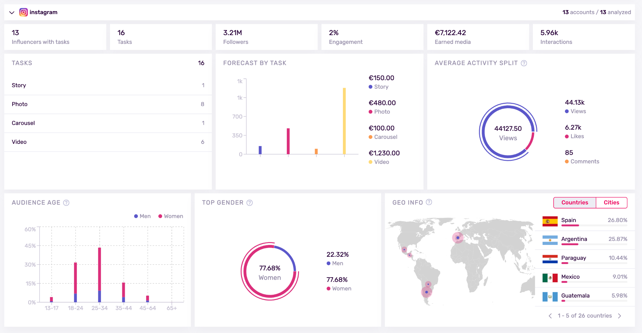 One key feature that sets Influencity apart is the predictive analytics tool that lets you estimate campaign outcomes before they go live. This predicts the performance of each influencer added to your estimate based on their profile metrics and assigned tasks. So you can predict campaign results and adjust budget allocations in advance.