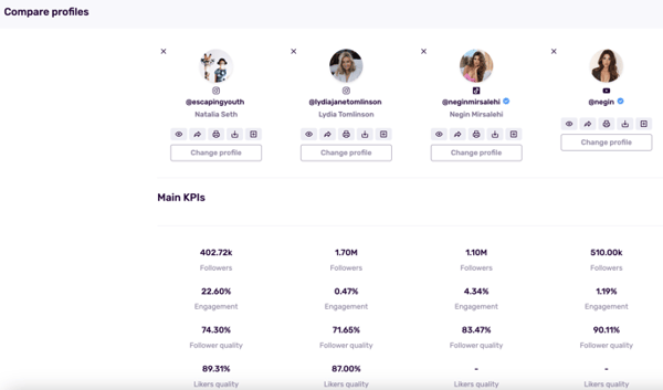 Influencity analyzes creator performance and shows you detailed metrics to understand where they stand. You can even compare profiles to see how creators measure up to their peers across engagement quality, EMV, CPE, and more. So it’s easy to identify which influencers are the right fit for you and how to negotiate fees accordingly.