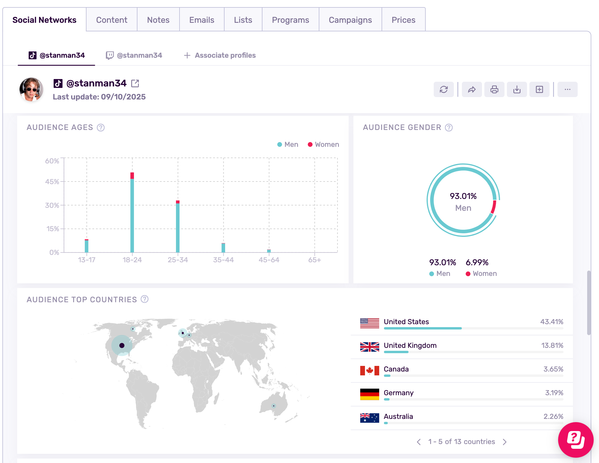 The platform’s detailed profile analytics include an influencer audience analysis to help you see what types of people an influencer is engaging. It shows you where their audiences are located, what languages they speak, and which ethnicities they are. So you can use these insights as leverage in your negotiations.