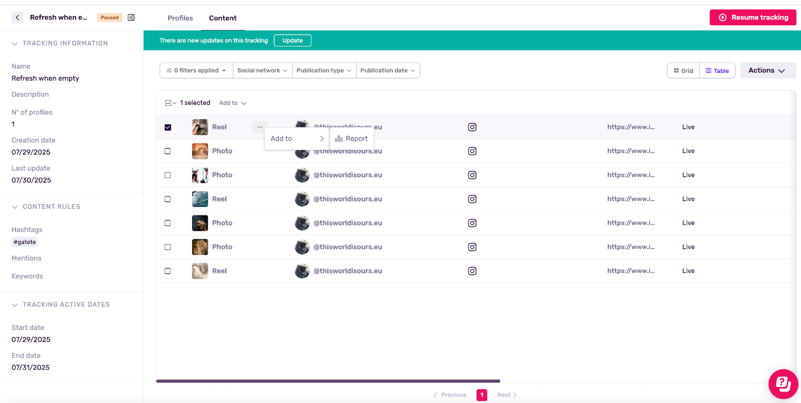 You don’t need to have influencers opt in to have their posts tracked. You can simply add their profiles to the tracking tool, and the platform will automatically pull data from every new piece of content they publish. This saves you the trouble of going back and forth with influencers, which means more time saved.