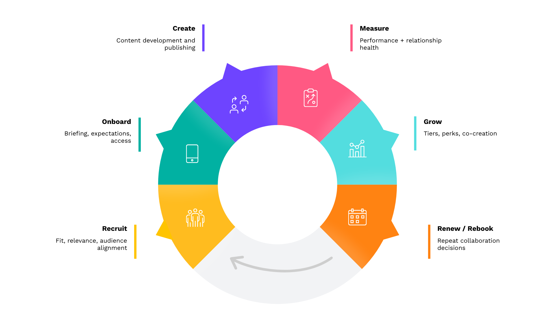 A simple way to think about it is a loop you run every quarter: Recruit, Onboard, Create, Measure, Grow, Renew.