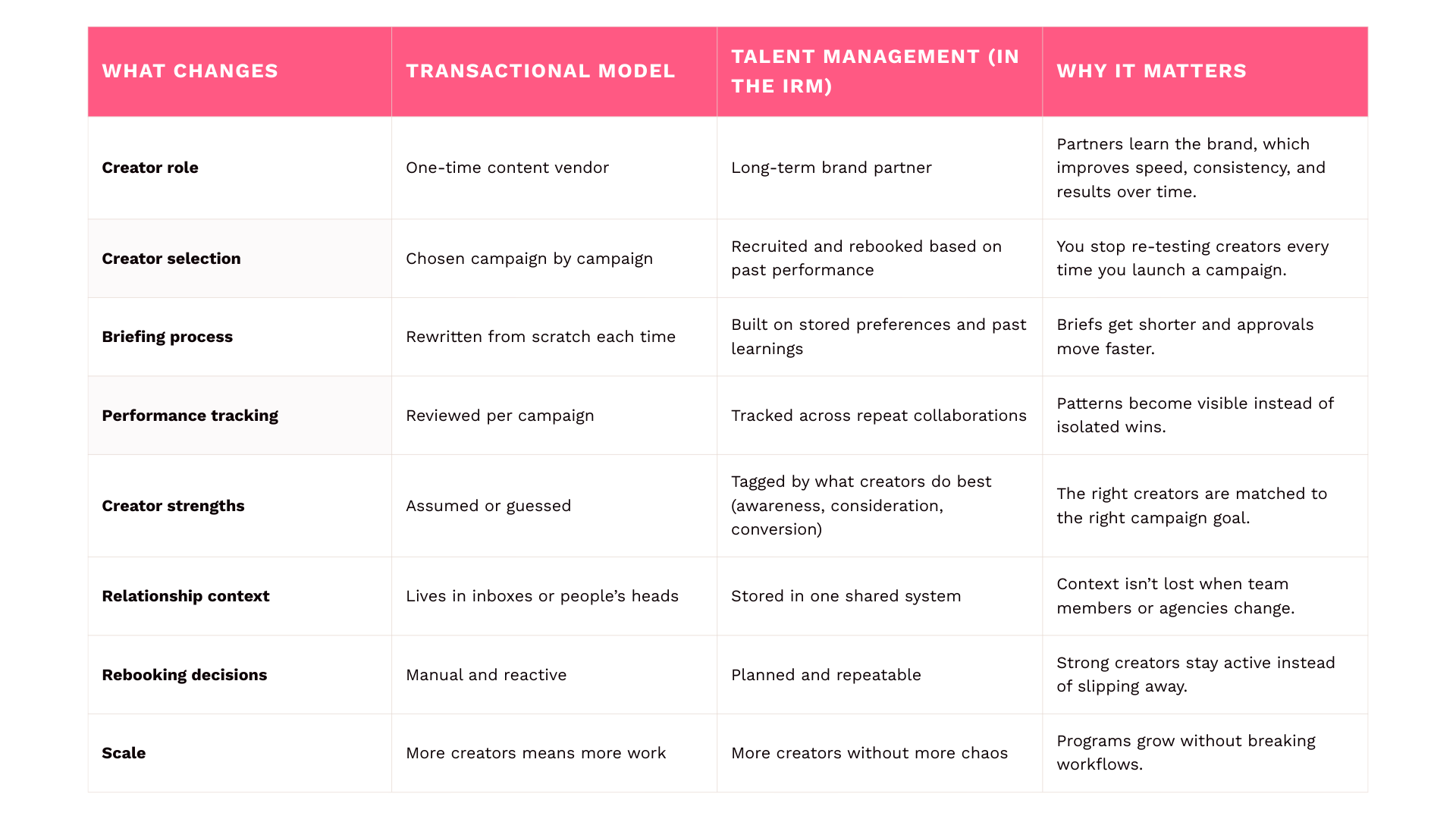 This is the difference between running influencer campaigns and running a creator program. A campaign ends. Social media talent management keeps the work moving forward by capturing what you learned and using it the next time.