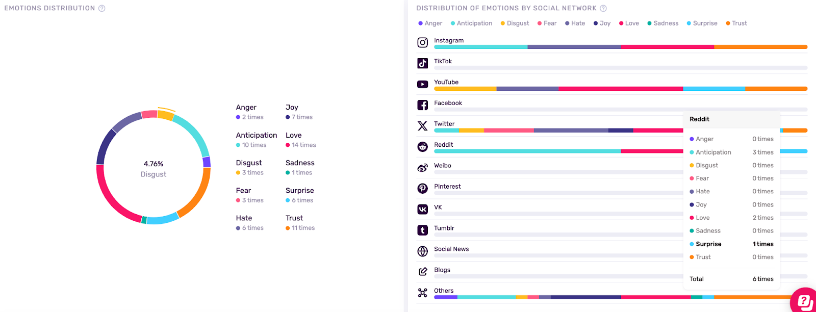 For instance, you’ll be able to see if there’s an increase in positive sentiment after launching your campaign. Or what emotions are expressed when people mention your brand, and how the patterns change over time. Do you see an increase in mentions that express anticipation after a certain influencer’s post goes live?