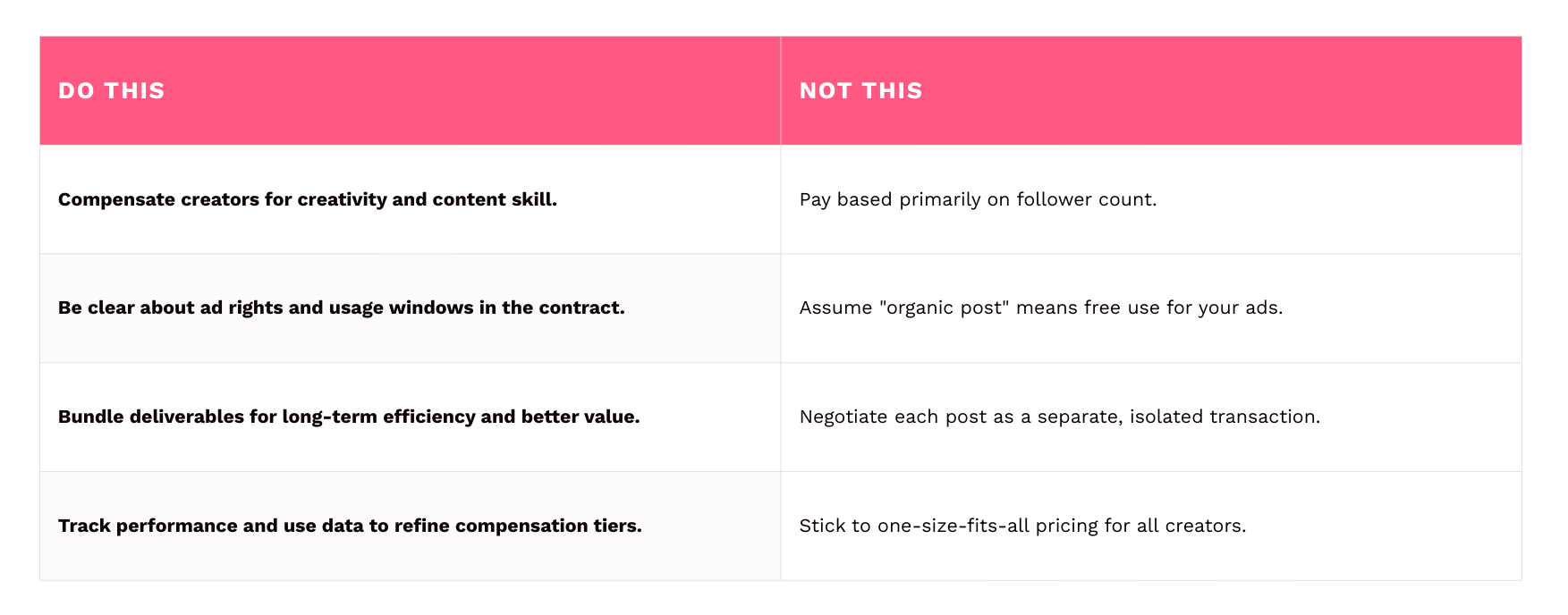 - Negotiate Usage Rights Smartly: Understand your campaign lifecycle. Negotiate limited usage rights (3 or 6 months) for creative testing and pay a premium for perpetual usage rights only when a piece of content becomes a proven, long-term winner. This saves budget.