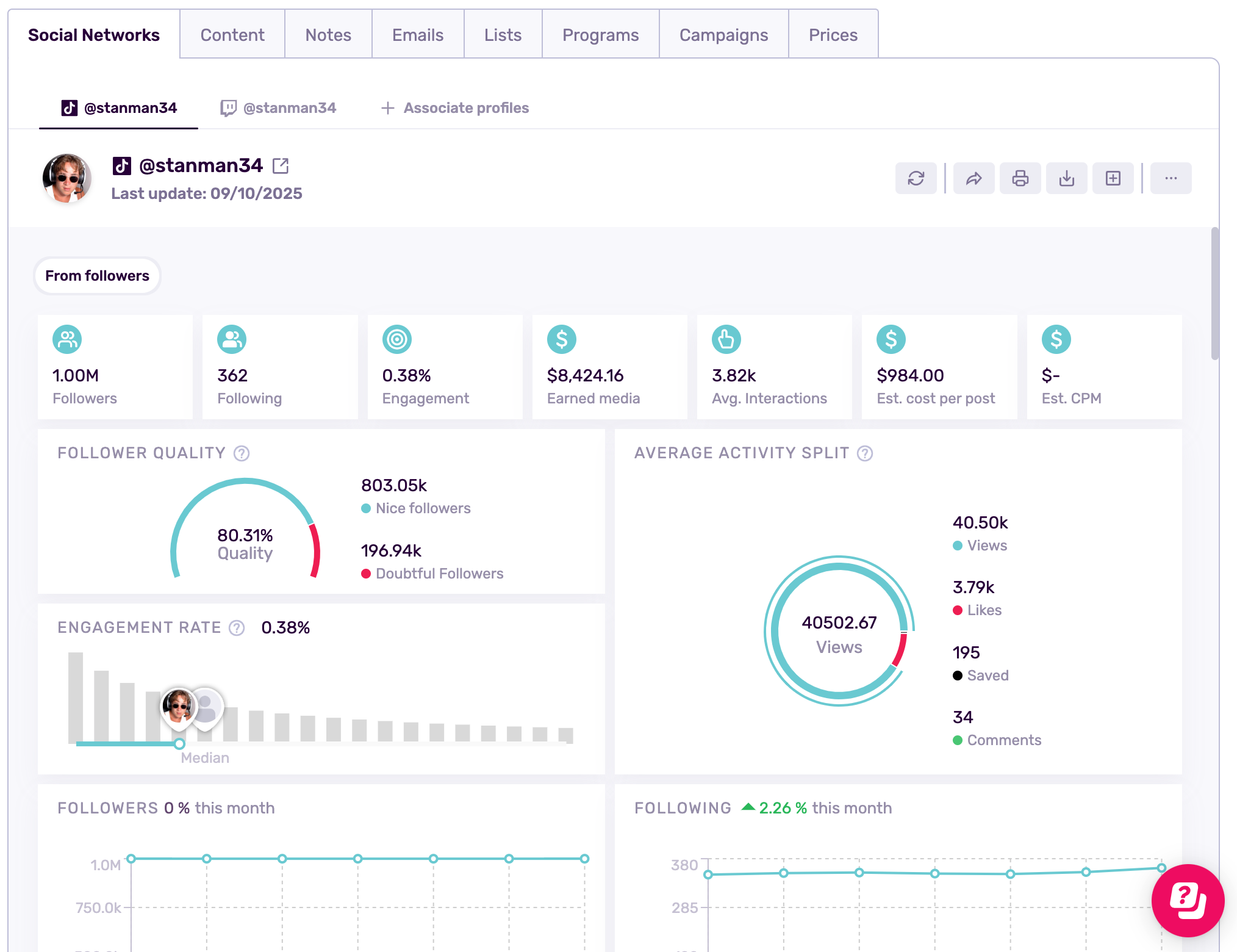 - Review “nice” vs. “doubtful” mix for follower quality.