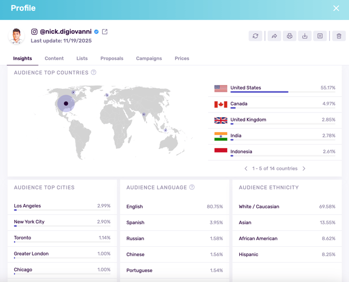 Tip: If an influencer’s audience is heavily skewed outside your target geography, treat them as a poor fit until proven otherwise. Ask for up-to-date audience breakdowns from native analytics (i.e., country, city, language), compare that to your campaign’s target region, and only move forward if you can (a) tightly geo-target paid amplification to the right countries or (b) see that the engaged audience (i.e., views, saves, clicks) is concentrated where you need impact; otherwise, deprioritize them in favor of creators whose follower base actually matches your market.