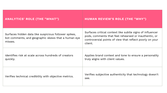 My key takeaway from managing vetting is this: Proper influencer vetting requires both analytics and human review.